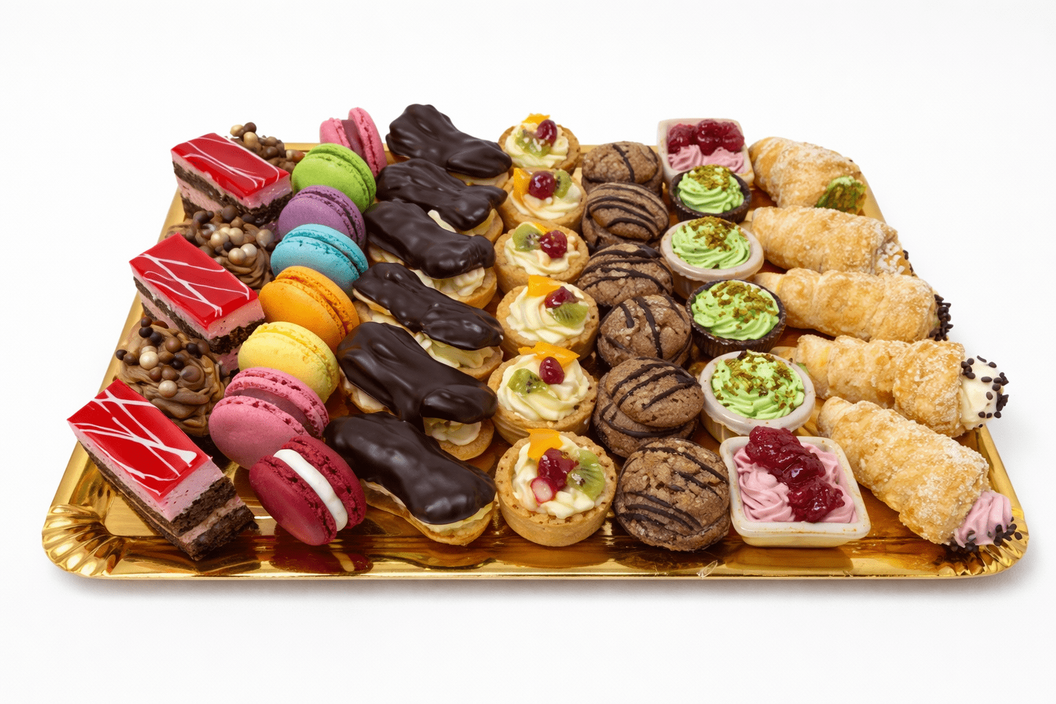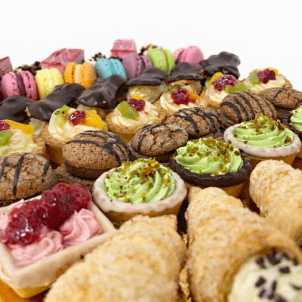 Cannoli, Mini-tarte Vanilie & Ciocolată, Coșulețe Zmeură & Fistic & Ciocolată, Mini-eclere, Macarons, Tartă Fructe Pret/ buc.